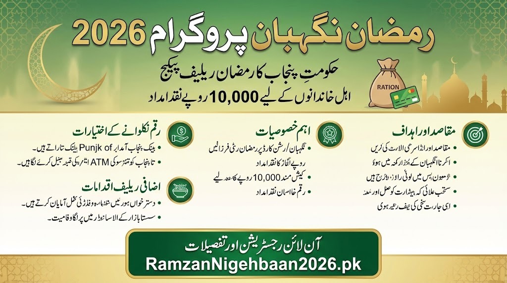 Chief Minister Punjab, Maryam Nawaz Sharif, has launched the Ramzan Nigehban Program 2026 Rs 10000/- Cash to provide relief to deserving families during the holy month of Ramzan. The Punjab Ramzan Rashan Program is a key component of the CM Punjab Ramzan Relief Package 2026. Thousands of eligible families across Punjab and other parts of Pakistan can benefit from initiatives such as the Ramzan Rashan Riayat Program 2026, PSER Survey, Muft Atta Scheme 2026, and the Prime Minister’s 9999 Ramzan Package under Prime Minister Shahbaz Sharif. Online registration for the Ramzan Nigehban Package 2026 is currently open and will continue before the start of Ramzan 2026. Many families have already been registered through the PSER Survey Punjab, while others are still awaiting survey teams. Such families are advised not to wait and complete their registration independently through the PSER Registration Portal 2026 and the 8070 Web Portal 2026 to ensure timely assistance.